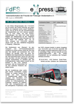 Der FdFS eXpressinformiert Sie stets aktuell und umfänglich über das Vereins-leben, sowie zu Themen des Nahverkehrs in und um Freiburg.Die Vereinsinformation erscheint als rein digitales Medium.Sie haben die Möglichkeit diese, via formloser Anmeldung, über Ihr E-Mail-Postfach zu beziehen:JA, ich möchte kostenfrei und un-verbindlichinformiert werden: