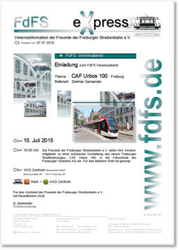 FdFS VereinsabendDie Vereinsabende finden in der Regel alle 8 Wochen statt. Dies jeweils an einem 2. Freitag in einem ungeraden Monat. Neben aktuellen Informationen aus dem Vereinsleben sowie dem ÖPNV in und um Freiburg erwarten Sie interssante Vorträge zu Themen des Nahverkehrs und Neben-bahnen in Europa und der übrigen Welt.Unsere Vereinsabende laden ebenso einfach zum gemein-samen Beisammensein, zum gegenseitigen Kennenlernen, so-wie zum Austausch von Erleb-nissen, Geschichten und Bildern ein. Außerdem bieten wir Ihnen die Möglichkeit zum gemein-samen Abendessen.Wir freuen uns auch Sie auf einem unserer Vereinsabende begrüßen zu dürfen! Nichtmit-glieder sind ebenso herzlich will-kommen!